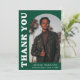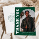 Na moda e cartões de agradecimentos de graduação de tendência apresentando a foto do formando na frente com um quadro de fotos de arco de offset. "Obrigado" é apresentado em letras brancas a negrito com retrorreflectores em fundo verde. Personalize a frente do cartões de agradecimentos de graduação de fotos em arco adicionando o nome do formando, a escola e o ano de graduação. A placa reverte para exibir sua mensagem digitada ou manuscrita. O cartões de agradecimentos de graduação verde é perfeito para formandos segundos graus e universitários.