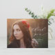 Este bonito cartões de agradecimentos de graduação apresenta uma fotografia de cheio e uma caligrafia moderna. A sobreposição de texto branco inclui a frase "obrigado você" escrita em script elegante, com o nome do formando e o ano de graduação abaixo. A tipografia sobrepõe uma foto horizontal de cheio do novo formando. Você pode adicionar fotos adicionais e/ou uma mensagem personalizada à parte traseira do cartão, se desejar.