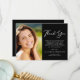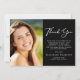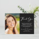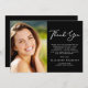 Elegante cartões de agradecimentos de graduação em preto com a foto do formando, "Obrigado" em um roteiro branco-na moda, seu obrigado personalizado que você envia e seu nome, escola e ano de aula em uma simples tipografia branca.