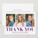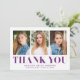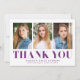 Simples cartões de agradecimentos de graduação com fotos do formando 3 na frente com "Obrigado" exibido em letras roxas em negrito. Personalize o cartões de agradecimentos de graduação de fotos adicionando o nome do formando, o nome da escola e o ano de graduação. A parte traseira da placa fornece espaço para sua mensagem de obrigado digitado ou manuscrito.