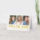 Simples cartões de agradecimentos de graduação com as fotos do formando 3 na frente com "Obrigado" exibido em letras em negrito amarelo. Personalize o cartões de agradecimentos de graduação de fotos adicionando o nome do formando, o nome da escola e o ano de graduação. O dentro da placa fornece espaço para a mensagem do obrigado digitado ou manuscrito.