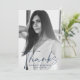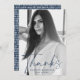 Cartões de agradecimentos de graduação simples e moderno com a foto vertical do formando com "Obrigados" em uma camada de script do marinho na moda. Personalize a frente do cartões de agradecimentos de graduação de fotos adicionando o nome do formando e o ano de graduação. A parte traseira do cartões de agradecimentos de fotos de graduação apresenta um marinho desenhado à mão e um fundo de padrão branco com espaço para sua mensagem escrita ou manuscrita.