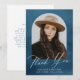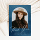 Cartões de agradecimentos de graduação elegante com dentro de fotografia do formando de um quadro de arco com um fundo de cor azul-marinho. "Obrigado" é exibido em um roteiro branco moderno de caligrafia com o nome do formando, a escola e o ano de formando mostrado abaixo. A parte traseira do cartões de agradecimentos de graduação de fotos fornece espaço para sua mensagem digitada ou manuscrita.