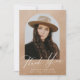 Cartões de agradecimentos de graduação elegante que inclui o dentro de fotografia do formando de um quadro de arco com fundo de aquarela de areia. "Obrigado" é exibido em um roteiro branco moderno de caligrafia com o nome do formando, a escola e o ano de formando mostrado abaixo. A parte traseira do cartões de agradecimentos de graduação de fotos fornece espaço para sua mensagem digitada ou manuscrita.