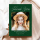 Cartões de agradecimentos de graduação elegante com "Obrigado" em um roteiro de caligrafia branca com a foto do formando exibida em um plano de fundo verde. Personalize o cartões de agradecimentos de graduação de fotos com o nome do formando, o nome da escola e o ano de graduação. A parte traseira do cartões de agradecimentos apresenta espaço para uma mensagem digitada ou manuscrita.