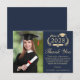 Cartões de agradecimentos de graduação em azul escuro moderno, com "Classe de" em uma ilustração em ouro claro da coroa de louros, incorporando um boné e um diploma de formando, uma foto do formando, "Obrigado" em uma elegante escrita em ouro claro, e um obrigado personalizado que você envia e o nome do formando em tipografia de ouro claro.