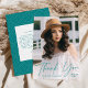 Cartão moderno de agradecimento de formatura com foto, apresentando a foto vertical do formando com "obrigado" em uma sobreposição de caligrafia azul turquesa manuscrita e gradiente branco opcional. Personalize a frente do cartão de agradecimento de formatura adicionando o nome do formando e o ano de graduação. O cartão de agradecimento com foto se inverte para apresentar sua mensagem personalizada com um padrão geométrico pontilhado azul turquesa e branco na moda. Remova a mensagem personalizada para escrever a sua própria à mão.
