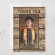 Um pano de fundo rústico de madeira country acentua uma das fotos de seu formando na frente e uma mensagem obrigado-você na parte de trás. Você pode digitar uma mensagem genérica pré-impressa ou excluir o texto de amostra para deixar o vazio de área para mensagens de obrigado pessoal escritas manualmente. DICA DA FOTO: Para obter resultados mais rápidos/melhores, selecione uma foto com o assunto no meio e/ou faça um pré-recorte para uma forma semelhante, conforme mostrado ANTES de carregar e ela preencherá o espaço de fotos perfeitamente. Entre em contato com o designer se você quiser que este design seja modificado, em outro produto ou quiser coordenar itens.