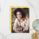cartões de agradecimentos de graduação de na moda com caligrafia branca, com letra branca, em forma de diamantes de ikat amarelo. Esta carta será perfeita para cartões de agradecimentos de casamento ou cartões de agradecimentos de graduação. Você pode personalizar a foto, os textos e o padrão posterior. Uma versão do cartão postal também está disponível.