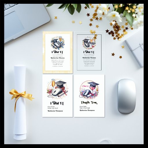 Expresse sua gratidão no verdadeiro estilo tecnológico com este cartão de agradecimento de formatura em Ciência da Computação "Eu Fiz!"! Com uma ilustração moderna de um mouse de computador, um chapéu de formatura e elementos comemorativos, este design é perfeito para graduados em TI e engenharia de software. O verso inclui um espaço para foto personalizável, permitindo que você adicione um toque pessoal. Ideal para enviar agradecimentos a amigos, familiares e mentores que apoiaram sua jornada acadêmica no mundo da tecnologia.