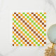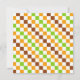 A vibrant checkered pattern of alternating green, orange, and brown squares on a white background. The design creates a lively, geometric feel.