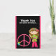 End your celebration off with this adorable girls' hippie birthday thank you card. it has a large hot pink peace sign with colored flowers on the side of it. Next to it is a cute girl with long brown hair. She has a colored tie dye shirt with matching headband. There's a hot pink border with white polka dots around a black center. Check out the many other designs and products in this line. ©JW Illustrations