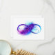 Símbolo infinito com uma bela pena pintada em cores roxas e azuis brilhantes sobre fundo branco.