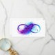 Símbolo infinito com uma bela pena pintada em cores roxas e azuis brilhantes sobre fundo branco.