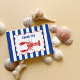 Envie cartões de agradecimento com um visual náutico. A frente destes cartões apresenta a minha ilustração de uma lagosta em vermelho, em estilo realista desenhado à mão, com a mensagem personalizável AGRADECIMENTOS acima em letras azuis. O texto e o gráfico estão inseridos numa moldura rendilhada vermelha e branca contra um fundo listrado azul e branco. O interior destes cartões é em branco para que possa escrever a sua própria mensagem com um gráfico de lagosta correspondente no canto inferior esquerdo.
