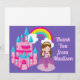 Um cartão de agradecimento de aniversário de princesa roxa bonita com uma linda menina com um vestido de rainha com laços cor-de-rosa em frente a um castelo rosa e azul gelo. Linda maneira de enviar agradecimentos após uma festa de aniversário infantil. Cartões de agradecimento personalizados para crianças.