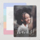 Este simples e fofo cartão de agradecimento com foto apresenta uma foto na frente com sangria total, com um texto elegante que diz "Obrigada!". A parte de trás do cartão contém um design de listras de arco-íris pastel em roxo pervinca, azul aqua, verde menta, pêssego coral e rosa claro. Os modelos de texto estão incluídos na parte de trás para personalização. Perfeito para enviar após uma festa de aniversário para uma garota pré-adolescente ou adolescente! Para pedidos de design personalizado ou produto, entre em contato comigo (Tracey) em orabellaprints@outlook.com.