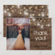 Este cartão de agradecimento bonito e elegante é o final perfeito para um casamento perfeito! O cartão apresenta potes de mason e luzes de cordão em um fundo de madeira rústica. Fácil de personalizar com seus próprios nomes e sentimento de agradecimento. Por favor, entre em contato comigo para quaisquer personalizações adicionais de design que você possa precisar para o seu belo casamento. Design © por TK Goforth. Para itens coordenados, visite minha coleção de casamento Rustic Mason Jar e String Lights e minha loja Zazzle: