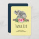 Cartões de agradecimentos plano com uma adorável design de aquarela. Mãe e bebê do urso Koala. O bebê está andando nas costas da mamãe. Em pé em um galho de árvore. Um buquê de flores de hibisco debaixo deles. Fundo amarelo de banana.