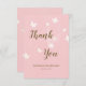 Um cartão de agradecimento personalizado para uma aniversariante doce e feminina de qualquer idade: 1º aniversário, 3º aniversário, 16º aniversário, 21º aniversário ou 50º aniversário para a sua festa de aniversário! Um fundo texturizado rosa empoeirado com um padrão floral: margaridas desenhadas à mão espalhadas. Na frente: grande texto manuscrito em dourado e o texto Obrigada, seu texto e a data. No verso: modelo personalizado para o seu bilhete de agradecimento e o nome em texto manuscrito e dourado.