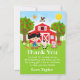Este cartão de agradecimento fofo e divertido apresenta uma menina de cabelo preto com pele clara ao lado de um celeiro vermelho com um cata-vento de galo. Há adoráveis animais de fazenda, como uma vaca, porco e galinha. Ao fundo, há um céu azul brilhante, macieiras, sol, borboletas e margaridas. O texto combina fontes negrito e sem serifa para um visual elegante e moderno. Isso é perfeito para uma festa de aniversário com tema de fazenda.