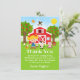 Este agradável e divertido cartão de agradecimento apresenta uma menina loira de pele clara ao lado de um celeiro vermelho com um cata-vento de galo. Há adoráveis animais da fazenda, como uma vaca, porco e galinha. Ao fundo, há um céu azul brilhante, macieiras, sol, borboletas e margaridas. O texto combina fontes negrito e sem serifa para um visual elegante e moderno. Isso é perfeito para uma festa de aniversário com tema de fazenda.