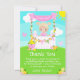 Este cartão de agradecimento fofo e caprichoso apresenta uma menina loira de pele clara em uma barraca de limonada rosa decorada com flores e bandeirolas. Ao fundo, há um céu azul, sol e borboletas. O texto combina fontes decorativas e sem serifa para um visual elegante e moderno. Isso é perfeito para uma festa de aniversário de verão.