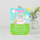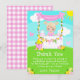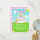 Este agradável e caprichoso cartão de agradecimento apresenta uma menina loira de pele clara em uma barraca de limonada rosa decorada com flores e bandeirolas. Ao fundo, um céu azul, sol e borboletas. O texto combina fontes decorativas e sem serifa para um visual moderno e elegante. Isso é perfeito para uma festa de aniversário de verão. Gráficos por MUJKA