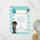 Lindo design de menino afro-americano na primeira comunhão azul com fundo de faixas azuis e confetes dourados. Gráficos por Mujka e KlouiseDigiArt no Etsy.