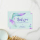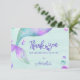 Mermaid birthday party thank you card with personalized message. Design features fantasy magical mermaid tails and ocean bubbles with "thank you" lettered in mermaid themed typography. It has a watercolor color palette of pink purple turquoise and mint green. Mermaid party invitations and supplies are available in store but please message me if you need further templates.