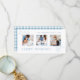 Design de Natal botânico minimalista limpo com saudação de script Feliz Feriados com folhas azuis empoeiradas desenhadas em linha, modelo de três fotos e campo de texto editável com padrão de tartã azul complementar no verso.