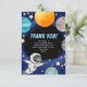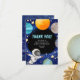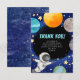 Para o pequeno que acaba de celebrar um aniversário com tema espacial. Este cartão de agradecimento de festa infantil espacial moderno pode ser personalizado com a inclusão de sua própria mensagem na frente. Também na frente, o texto de design 'OBRIGADO' pode ser mantido como está ou editado. Agradeça aos convidados por comparecerem à festa do seu pequeno com esses cartões de agradecimento temáticos espaciais fofos.