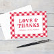 Um cartões de agradecimentos de casamento festivo e na moda para um CHURRASCO de verão casual no quintal. Inclui texto personalizado para os nomes da noiva e do noivo ou outro texto. Cor design vermelha e branca com fundo em forma de gingham / xadrez de mesa. O formato de cartão dobrado inclui espaço no dentro para uma mensagem manuscrita.