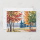 Uma pintura aquosa de uma paisagem de outono com um caminho de sujeira passando por árvores coloridas. As árvores à esquerda têm folhas vermelhas e laranja profundas, enquanto as árvores à direita se transitam de amarelo para verde. Um pinheiro azul alto fica na distância média. O caminho é pintado em tons castanhos quentes com folhas laranja caídas espalhadas ao longo dele. O plano de fundo apresenta colinas em tons azuis e roxos silenciados. O céu está pintado em lavagens brancas e azuis, criando uma atmosfera pacífica de outono. A grama ao longo do caminho é renderizada em vários tons de verde e ouro. A pintura tem um estilo flexível e expressivo típico de técnicas de aquarela, com pinceladas visíveis e hemorragia colorida. A composição é equilibrada com as árvores que criam linhas diagonais fortes que vão do primeiro ao segundo plano. A paleta de cores é composta por vermelhos, laranjas, amarelos, verdes, azuis e castanhos, capturando a essência de um dia de queda.