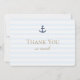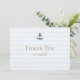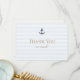 Este modelo de cartão de agradecimento náutico personalizado é perfeito para agradecer a convidados e bem-intencionados em diversas ocasiões, incluindo casamentos, nascimentos, aposentadorias e outros marcos. Ele apresenta uma âncora azul-marinho e texto em um tom dourado elegante em uma base que inclui listras horizontais azuis suaves. A âncora não é uniformemente colorida, há pontos sem cor, o que lhe dá uma aparência quente e desgastada e um sabor de artesanato que nos lembra uma impressão de xilogravura ou uma escultura em madeira. Na verdade, a imagem da âncora que inspirou este design foi originalmente feita com um carimbo simples, o que explica seu charme. No verso, incluímos algum texto placeholder no mesmo tom dourado. Você pode incluir seu(s) nome(s) no final da sua mensagem personalizada ou deixá-los de fora em favor de assiná-lo à mão. E, claro, se preferir, pode deixar o verso completamente em branco para que possa escrever sua mensagem inteiramente à mão. Em qualquer caso, por favor, certifique-se de excluir nosso texto placeholder! Você também pode alterar