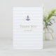 Este modelo de cartão de agradecimento náutico personalizado é perfeito para agradecer a convidados e bem-intencionados em diversas ocasiões, incluindo casamentos, nascimentos, aposentadorias e outros marcos. Ele apresenta uma âncora azul-marinho e texto em um tom dourado elegante em uma base que inclui listras horizontais azuis suaves. A âncora não é uniformemente colorida, há manchas sem cor, o que lhe dá uma aparência quente e desgastada e um sabor de handmade que nos lembra uma impressão de bloco de madeira ou uma escultura em madeira. Na verdade, a imagem da âncora que inspirou este design foi originalmente feita com um carimbo simples, o que explica seu charme. No verso, incluímos algum texto placeholder no mesmo tom dourado. Você pode incluir seu(s) nome(s) no final da sua mensagem personalizada ou deixá-los de fora em favor de assiná-lo à mão. E claro, se preferir, você pode deixar o verso completamente em branco para que possa escrever sua mensagem inteiramente à mão. Em qualquer caso, por favor, certifique-se de excluir nosso texto placeholder! Você também pode alterar a cor