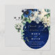 The front features a deep navy blue geometric background with soft floral accents and a balanced, easy-to-read layout. The back is coordinated with the rest of the stationery suite and includes the couple’s initials, wedding date, and an editable decorative bouquet element that can be replaced with a QR code, a photo, or removed entirely for a cleaner look.