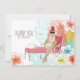 Cartão de agradecimento da festa de solteira na praia com flores tropicais, brilho e noiva a ser apresenta cabelo loiro, castanho ou ruivo e tom de pele claro ou escuro.