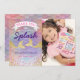 Cartões de agradecimento de aniversário sob o mar com uma foto de seu filho, um fundo colorido com padrão de vieira de sereia pastel, brilho dourado e rosa, algas, duas caudas de sereia com brilho dourado e um modelo de agradecimento de festa infantil fofo e fácil de personalizar.