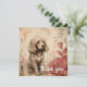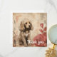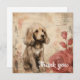 Um filhote ouro castanho com pelo liso está sentado ao lado de um casal de grandes rosas estilizados. O plano de fundo apresenta tons bege abstrato com sutis contornos florais e marcas semelhantes a scripts, dando uma sensação suave e vintage a toda a composição.