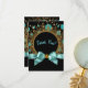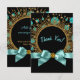 Cartão de agradecimento azul teal e dourado com pontos brilhantes azul teal e dourado e explosão de estrelas. Este lindo cartão de agradecimento de festa de aniversário e evento estilo flat azul teal e dourado é facilmente personalizado adicionando sua mensagem no estilo de fonte e cor e redação de sua escolha. Este é um design impresso sem jóias reais, brilhos, laços, etc.