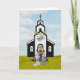 Uma noiva, noivo e seu Clergyman em frente à igreja realizando a cerimônia de casamento sob o céu azul cheio de nuvens e pombas de amor voando. Fofo, divertido e totalmente personalizável.