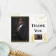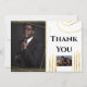 Cartões de agradecimento simples, elegantes e sofisticados, adequados para todas as ocasiões. As palavras "obrigado" aparecem em uma fonte fluída estilo caligrafia preta, que é elegante e sofisticada. Há formas geométricas e espirais douradas falsas espalhadas ao redor das fotos e nas bordas, dando um visual moderno e sofisticado ao design geral. Há 2 modelos de foto para suas imagens especiais na frente e modelos no verso do cartão para sua mensagem personalizada de agradecimento para familiares ou colegas de trabalho. Ideais para eventos corporativos, agradecimentos de formatura ou qualquer ocasião especial em que você queira agradecer aos convidados por se juntarem a você.