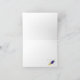 Um céu azul com estrelas. Um foguete espacial azul com detalhes vermelhos e verdes decolando para o espaço sideral. Um cartão de agradecimento divertido.