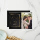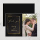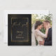 Adicione sua foto de casamento a este Elegante Obrigado preto e dourado - uma moldura dourada cerca os detalhes com um brilho de purpurina dourada. Criado para a BarefootBride™ por © WhimsicalArtwork™ Personalize o texto, estilo de fonte, cor e tamanho. Criamos este modelo para facilitar a personalização com suas próprias informações. Esta é parte de uma Suite de Papelaria de Casamento completa com papelaria de casamento, chá de bebê e outros eventos projetados por © WhimsicalArtwork™.