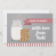 Um cartão de agradecimento listrado de leite e biscoitos moderno adorável, ótimo para um chá de bebê. As cores são cinza, rosa e branco. É um estilo moderno. O design tem uma pilha de biscoitos com gotas de chocolate com uma garrafa de leite.