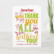 Diga obrigados de estilo. Este fabuloso design de tipografia apresenta uma mensagem de obrigado vermelho, verde e laranja. Um cartão de saudações maravilhoso para mostrar sua apreciação. Seria perfeito para um funcionário ou colega de escritório - ou apenas para mostrar a um amigo o quanto você os aprecia. Pode ser personalizado com nome e mensagem próprios.