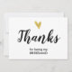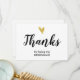 Elegante cartão de agradecimento de casamento com coração de folha de ouro falso com escrita preta moderna em um fundo branco clássico.