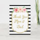 Cartão de agradecimento para os pais da noiva ou do noivo no dia do seu casamento em um clássico padrão de listras pretas e brancas, detalhes em dourado vintage, flores cor-de-rosa e pêssego rústicas e texto em estilo de letra à mão.