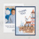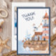 Um cartão de agradecimento costeiro suave com detalhes de um farol pintado à mão, veleiro, ave marinha e concha. O verso pode ser personalizado com sua própria mensagem e foto favorita da festa de aniversário.